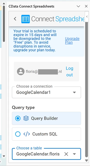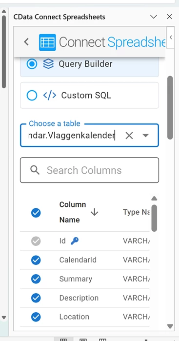 But when I select my primary calendar [removed by moderator] , none of that happens. The CData Connect Spreadsheets panel still ends at the Table dropdown, and there is no way to proceed with data import (see 1st screenshot). Which means that I cannot import data from my primary calendar into Excel. Which is my main use case for the software.