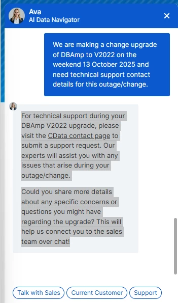 For DBAmp technical support, please feel free to reach out to us at [email protected]. We are happy to help with any issues or questions that you have!