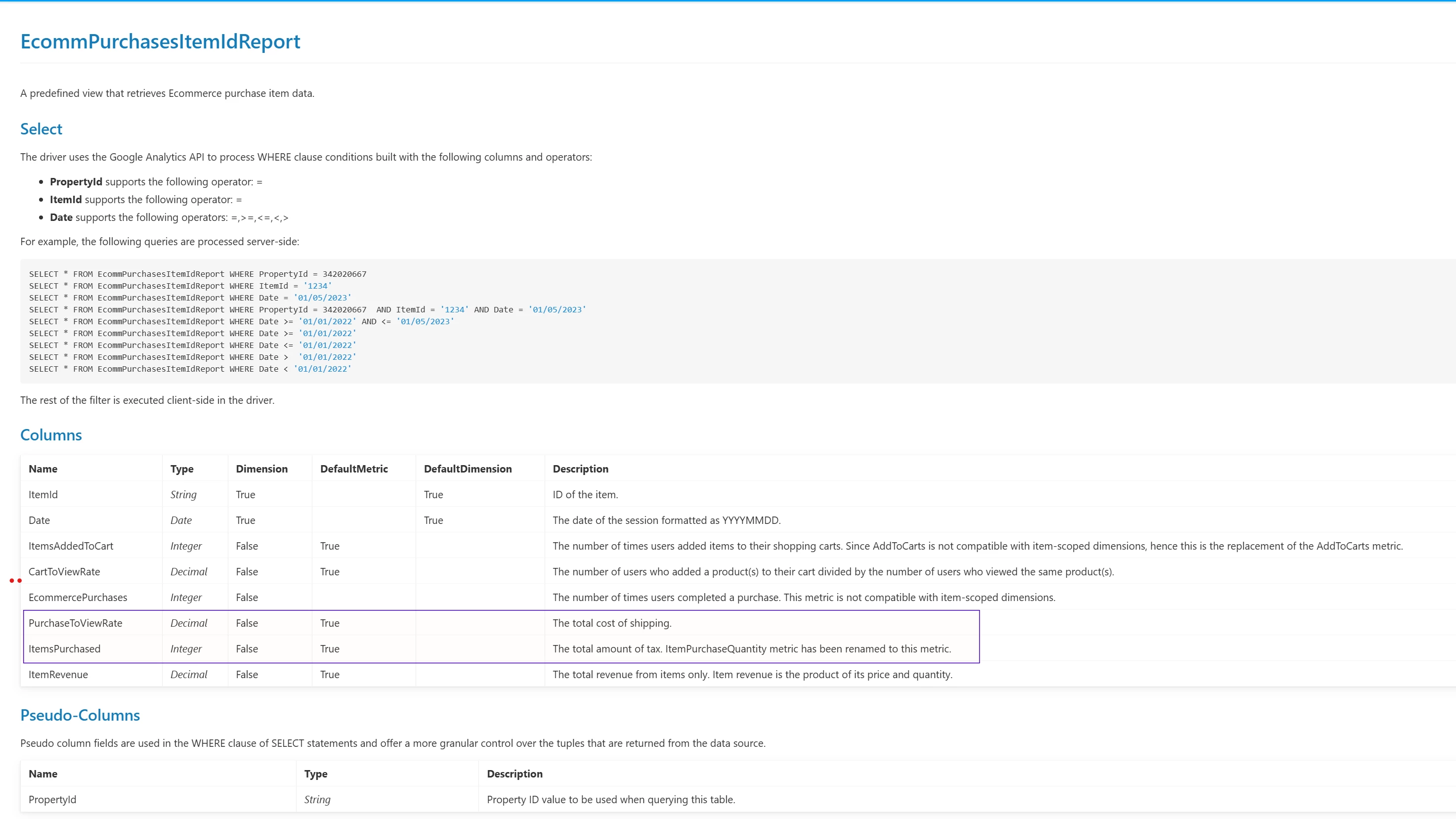 Regarding the incorrect description of the PurchaseToViewRate and ItemPurchased columns in the documentation, we have raised this with the documentation team. Thank you for reporting this!