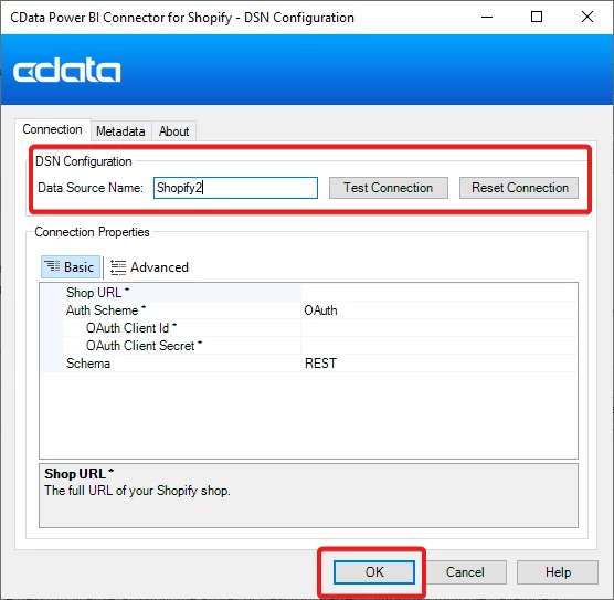 This will open a new and unnamed DSN Configuration window. In this window, you can set the Data Source Name as you wish, such as 'Shopify2', then configure and test the connection and press 'OK' to save the connection: