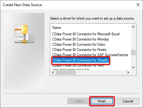 In the new window, scroll down and select 'CData Power BI Connector for Shopify' then press 'Finish' as shown below: