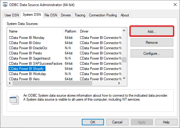To configure a new DSN, first, open the ODBC Data Source Administrator(64-bit) and go to the 'System DSN' tab then press the 'Add' button as shown below: