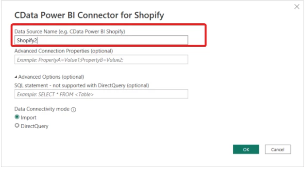 After saving the DSN Configuration, you can open Power BI, select Get Data and choose 'CData Shopify'. In the following window, you can set the Data Source Name to the name of your new connection, such as 'Shopify2', and you should be good to connect: