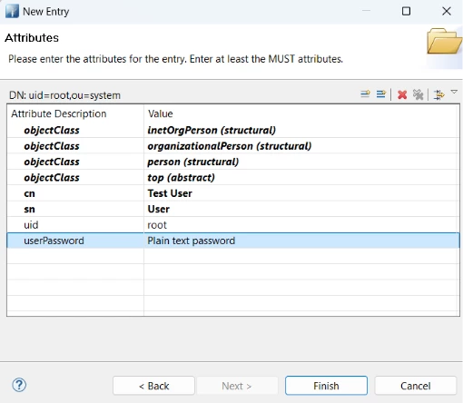3.5 userPassword: password123 (make sure to encode as plain or MD5)