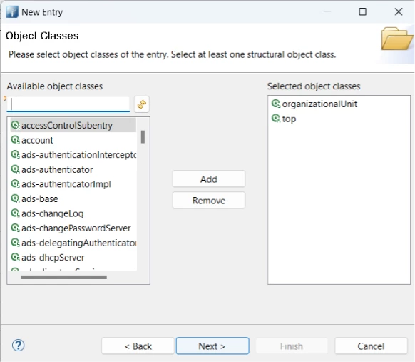 Object Classes: Define the schema for entries, including required and optional attributes.