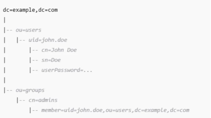 Attributes: Key-value pairs describing the entry (e.g., uid, cn, sn, mail).