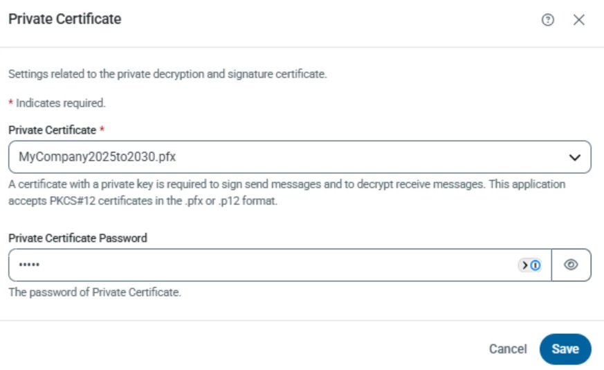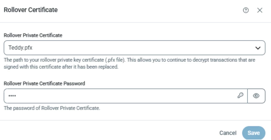 Because it is easy to lose track of certificates configured in the advanced tab, it is recommended that you check in again in the future to see if the partner can use the new certificate, at which point this field can be cleared.