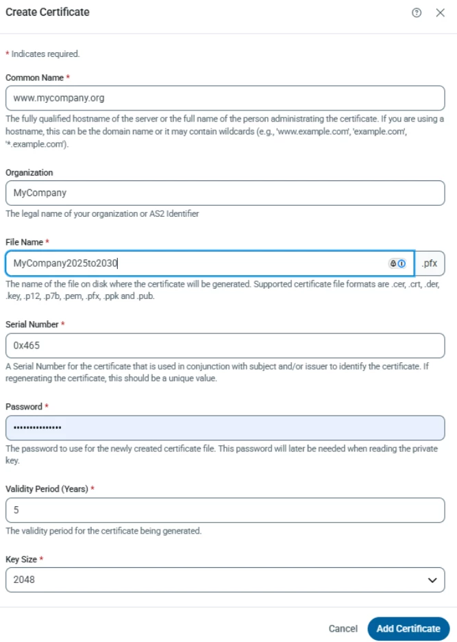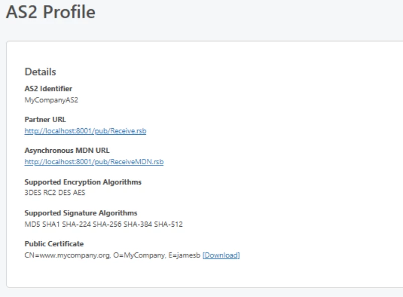 Most commonly, the Organization is a match for your identity in the AS2 profile. The Common Name is often used for SSL/TLS certificates and matches the domain name you’re hosting on, but in most cases, it is not important that this match your domain.