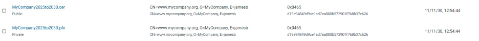 When you’re done, you’ll notice that two certificates were created, one private key (pfx) and one public key (cer):