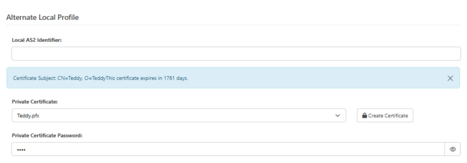 If you have any certificate present in this selection, note that if you update your Personal Certificate in the AS2 Profile, the application will continue to use your Alternate Local Profile until you clear it. If you have a partner that you have an Alternate Local Profile certificate configured that you wish to sync up to your new certificate, be sure to clear the Alternate Local Profile -> Private Certificate section when cutting over to the new certificate.