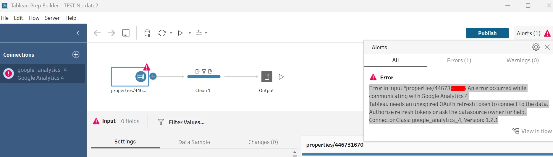 “Error in input “properties/446731XXXX”. An error occurred while communicating with Google Analytics 4 Tableau needs an unexpired OAuth refresh token to connect to the data. Authorize refresh tokens or ask the data source owner for help. Connector Class: google_analytics_4, Version: 1.2.1”