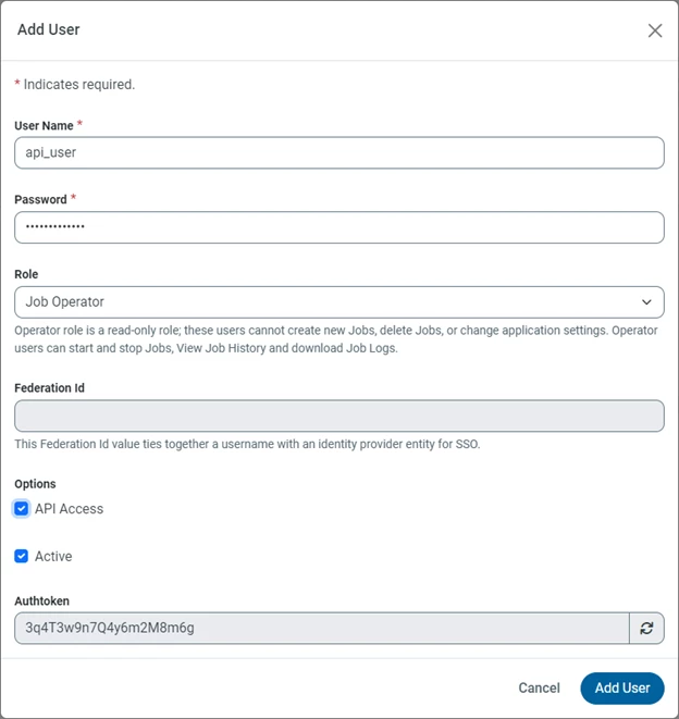 - You'll first need to generate a Sync Authtoken. In CData Sync, navigate to Settings > Users > Add User. Create a user with at least the Job Operator role and make sure the "API Access" checkbox is enabled.