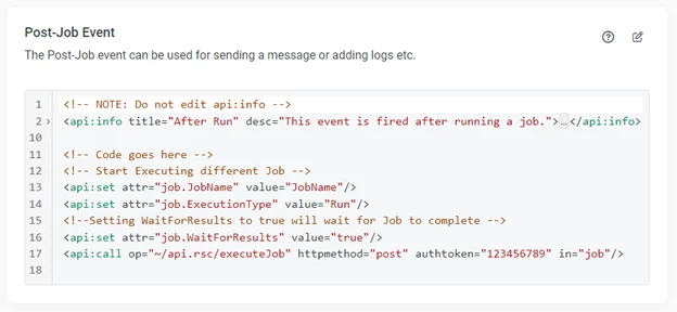 - Under Post-Job Events, paste the following scripting snippet on line 12. Replace "JobName" with the name of the job you wish to run next. Replace "123456789" with the Authtoken from Step 2.
