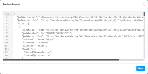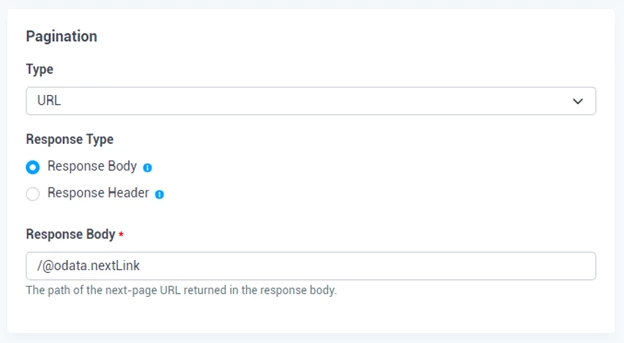 } The @odata.nextLink field represents the URL of the next "page" of data for the API. Set the Pagination Type to "URL," select "Response Body" for Response Type and set Response Body to "/@odata.nextLink" (the "/" indicates the top of the response body) to configure pagination for our example API.