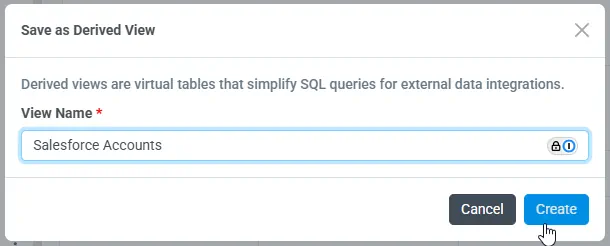 2. Next, create the query in the Query Builder or SQL Editor. After you execute the query, the Save button appears. Click Save > Save as Derived View. The Create Derived View dialog appears.