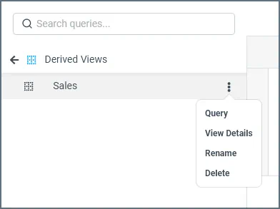 4. The new Derived View should now appear under the Derived Views Folder. Click the three vertical dots to the right of the new Derived View and then click Query to populate the text editor with code.